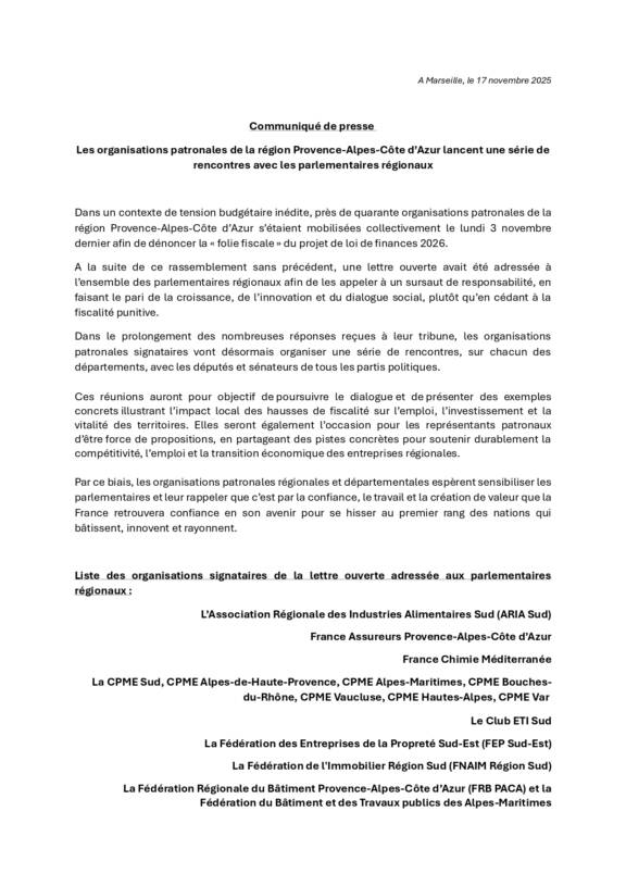 Les organisations patronales de la région Provence-Alpes-Côte d’Azur lancent une série de rencontres avec les parlementaires régionaux