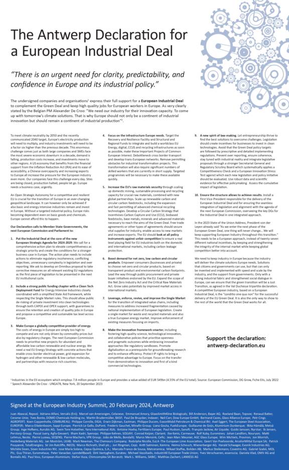 La Communauté de la Déclaration d'Anvers, qui représente plus de 1 300 entreprises, associations et syndicats à travers l'Europe, s’est réunie le 11 février 2026 à Anvers à l’occasion de la 3ᵉ édition de l’European Industry Summit, un rendez-vous majeur consacré à l’avenir de l’industrie européenne. L’appel est simple : prendre des mesures urgentes et audacieuses pour restaurer la compétitivité industrielle de l'Europe, préserver les emplois de qualité pour les travailleurs européens et concrétiser le Pacte pour une industrie propre dans les usines dès 2026.